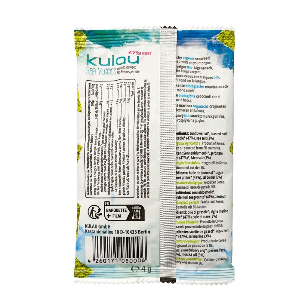 Der KULAU Bio-Nori-Snack ist ein wahrer Genuss und ein neues Geschmackserlebnis für den europäischen Gaumen. Zarte, knusprige Blätter, die auf der Zunge zergehen und einen milden Meeresgeschmack hinterlassen. Der Algensnack besteht aus Nori-Algenblättern (62 %), die nur mit Bio-Sonnenblumenöl und natürlichem Meersalz verfeinert sind und geröstet werden. Ob pur, als Topping für einen frischen Salat oder Erste-Hilfe-Mittel bei Sushi-Heißhunger: Der KULAU Bio-Nori-Snack ist eine willkommene Abwechslung in der Snack-Welt mit einer Fülle an Ballaststoffen, Eiweiß und Jod.