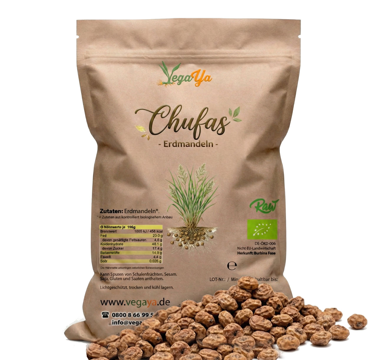 Erdmandeln sind von Natur aus ballaststoffreich, glutenfrei und vegan. Du kannst sie pur snacken, ins Müsli geben oder in Wasser einweichen und daraus pflanzliche Drinks, Pürees oder Desserts zaubern.
