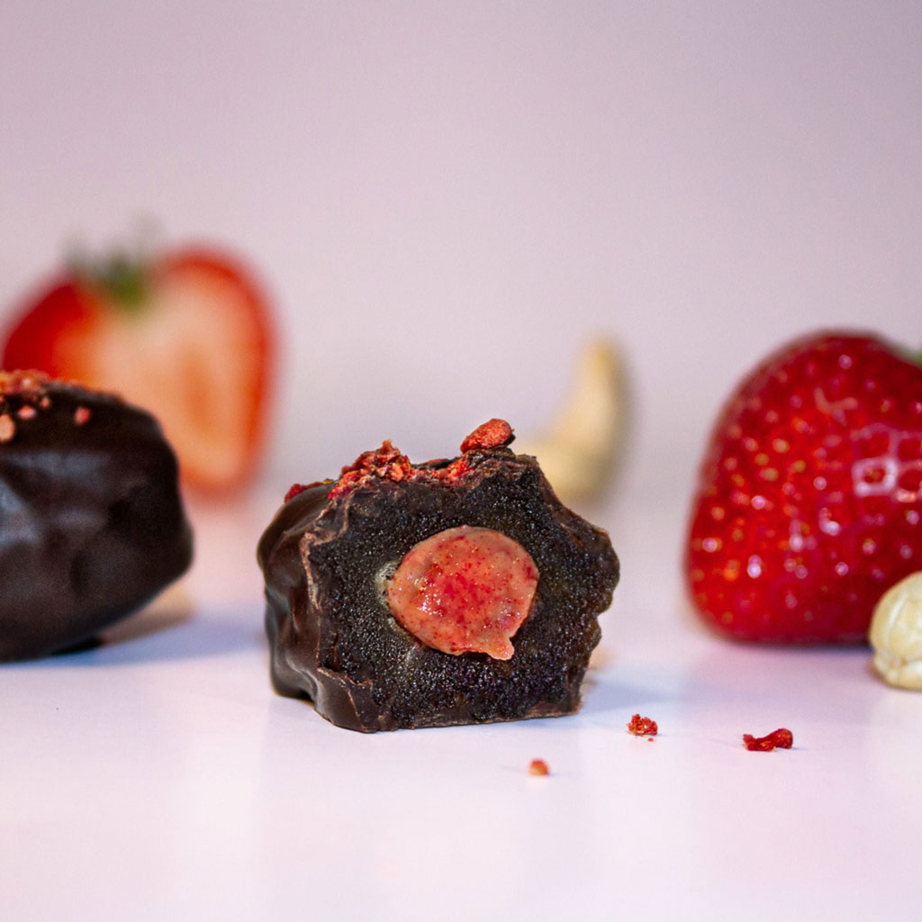 Zutaten: Medjool Datteln *(75%), Kakaomasse *(11%), Cashewnüsse creme*, gefriergetrocknete Erdbeere*, Dattelsirup*, Kakaobutter*.