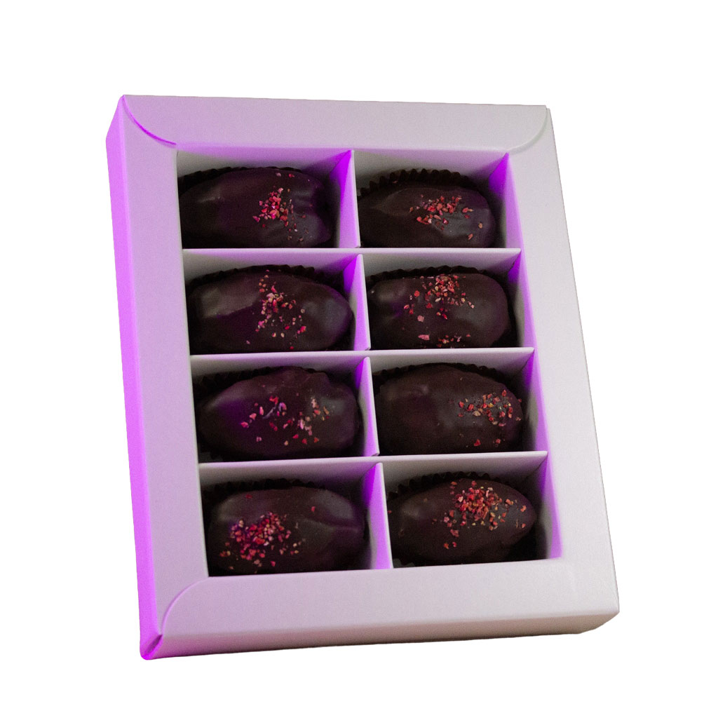 • Ready to Gift: Hochwertige Design-Box mit 8 exklusiven Dattel-Pralinen.