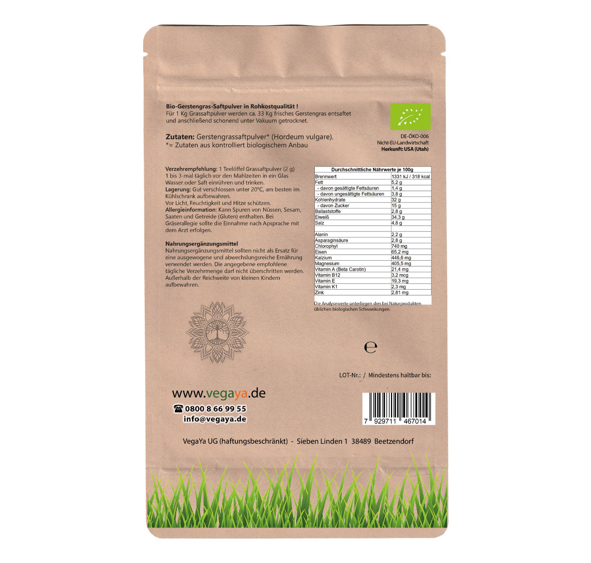 Verzehrempfehlung: 1 Teelöffel Grassaftpulver (2 g) 1 bis 3mal täglich vor den Mahlzeiten in ein Glas Wasser oder Saft einrühren und trinken.