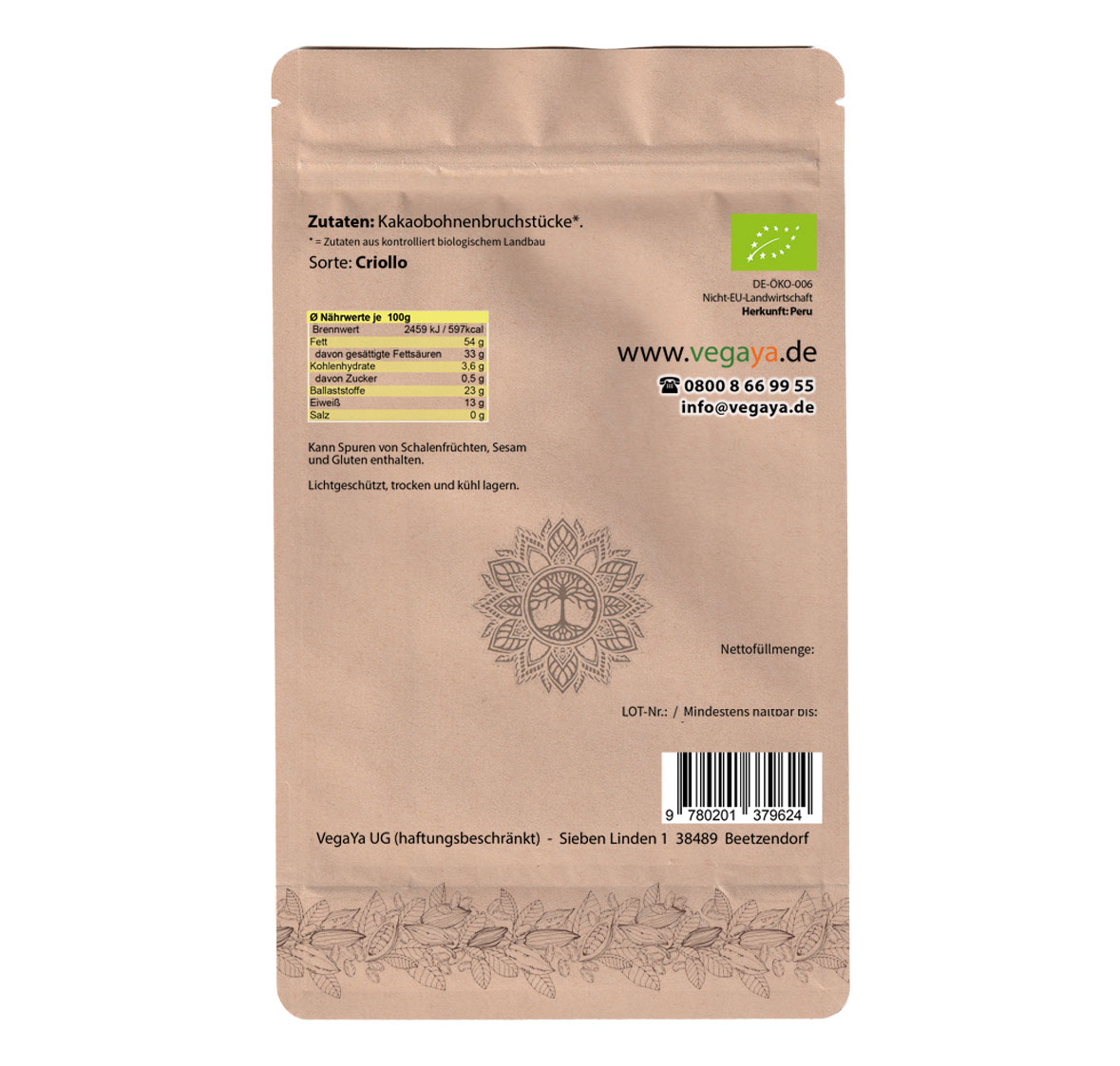 Unsere Kakaonibs stammen aus sorgfältig ausgewählten Kakaobohnen der Sorte Criolo aus Peru. Die Bohnen werden behutsam fermentiert und schonend temperturkontrolliert getrocknet, um ihre reinen Aromen und wertvollen Inhaltsstoffe zu bewahren.