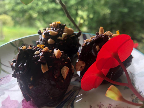 Bällchen in geschmolzene Schoki tunken und mit dem Topping verzieren. Zum Schluss mit ein wenig abgeriebener Mandarinenschale dekorieren.
