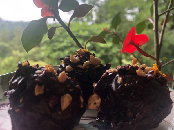 Erdnüsse (Erdnussmus), Maulbeeren, Maca, Vanilleschote miteinander im Blender vermengen und Bällchen formen.