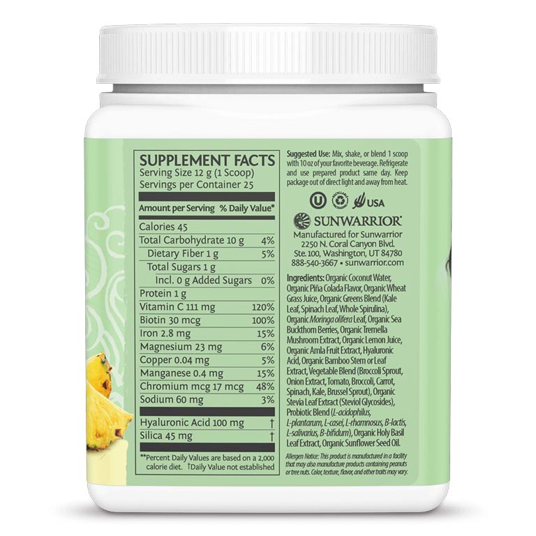 Zutaten: Kokoswasser*, Piña-Colada-Geschmack*, Weizengrassaft*, Grünmischung* (Grünkohlblatt, Spinatblatt, ganze Spirulina), Moringa Olifera-Blatt*, Sanddorn*, Tremella-Pilzextrakt*, Zitronensaft*, Amla-Fruchtextrakt*, Hyaluronsäure, Bambusstamm oder Blattextrakt*, Gemüsemischung (Brokkolisprosse, Zwiebelextrakt, Tomate, Brokkoli, Karotte, Spinat, Grünkohl, Rosenkohl Sprout), Stevia-Blattextrakt (Steviolglycoside)*, probiotische Mischung (L-acidophilus, L-Plantarum, L-Casei, L-Rhamnosus, B-Lactis, L-Salivarius, B-Bifidum), Basilikumblatt-Extrakt*, Sonnenblumenöl *.